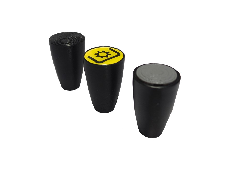 Ogni pomello ha una cover rimovibile in vari colori (rosso, nero, grigio, arancio) al cui posto può essere attaccato un adesivo a discrezione del cliente anche in un secondo momento